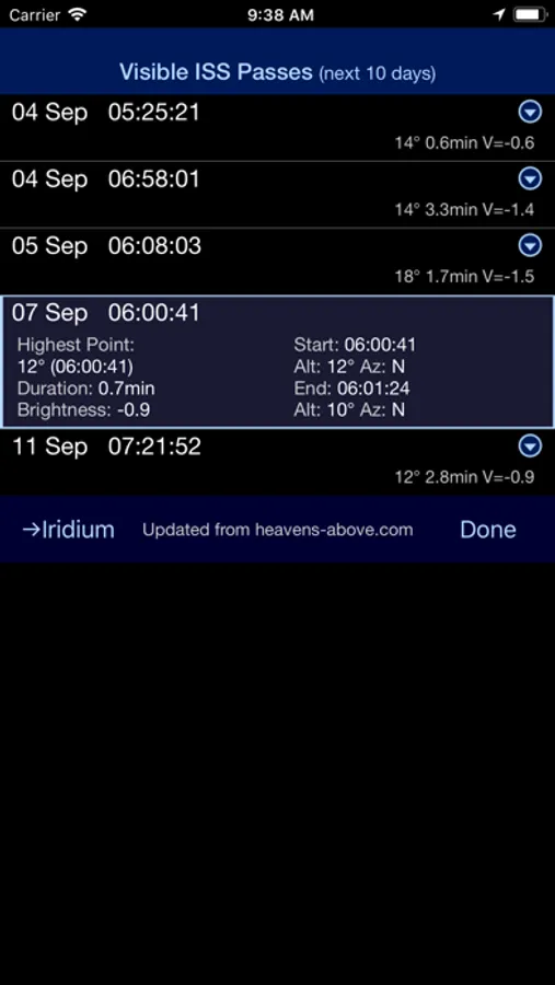 ISS and bight satellite passes for your location are also shown (data from heavens-above.com).