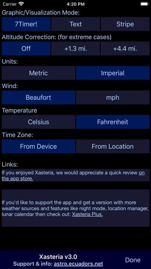 Xasteria will always be ad-free. If you would like to support it, as well as fund the 7Timer service behind it, you can get Xasteria Plus, which can access non-free weather sources and has some extra features like night vision mode, iPhone landscape view, lunar calendar, location manager.