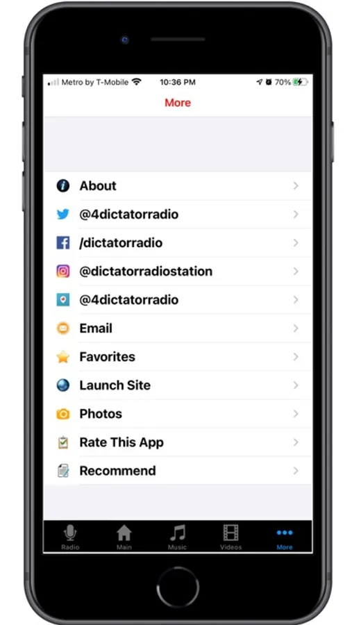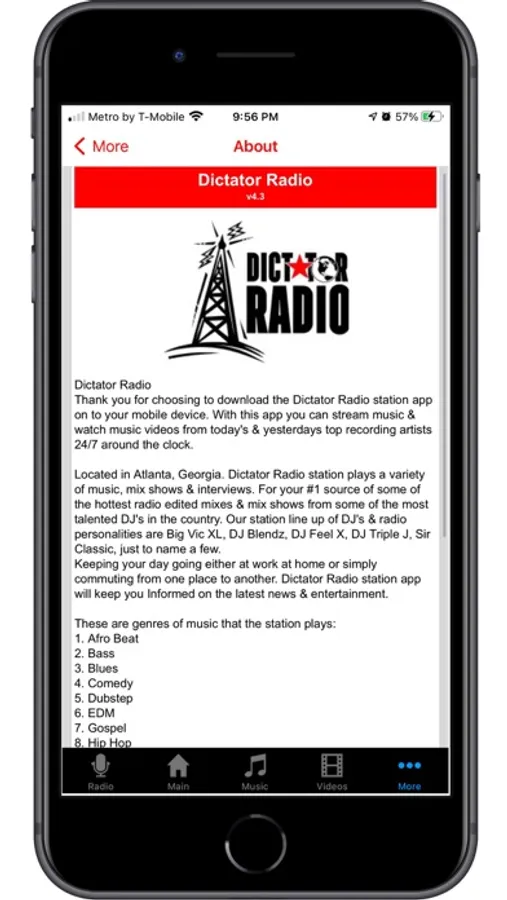 Thank you for choosing to download the Dictator Radio station app on to your mobile device. With this app you can stream music & watch music videos from today's & yesterdays top recording artists 24/7 around the clock.