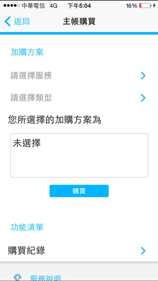 3.「主帳購買」:顯示該門號可購買之方案清單及詳細內容,可依需求扣主帳進行購買。