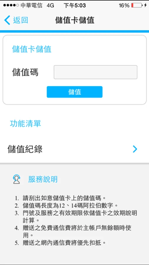 2.「儲值」:以儲值卡上的儲值碼進行金額、方案儲值,或以信用卡進行金額、方案儲值。