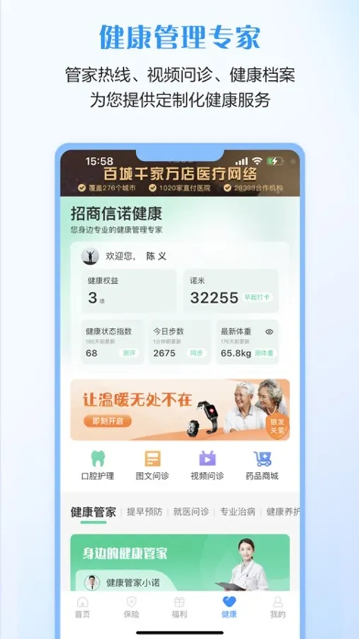 关心你,不是说说而已。视频问诊、健康测评、健康档案为你提供定制化健康服务。