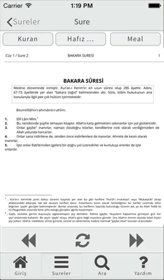 Uygulama, Kur'an-ı Kerim ve mealini okumak, Kur'an içerisinde sayfa ve cüz araması yapmak gibi özellikler içerir. Sesler Fatih Çollak ve merhum İsmail Biçer hoca efendilere, hat Ahmet Hüsrev hattı ve meal kısmı ise Diyanet İşlerine aittir. Uygulama içerisinde hocalar arası kıraat geçişi bulunmaktadır. Uygulama istifade etmeniz amacıyla internet gerektirmeden çalışmaktadır.