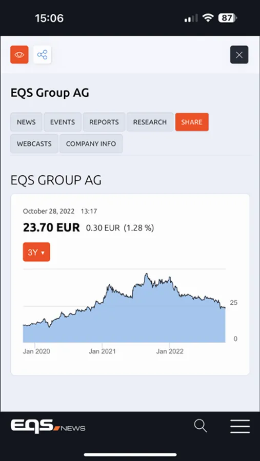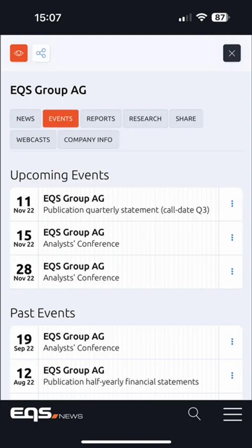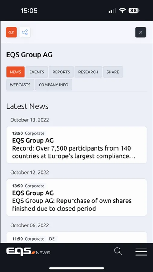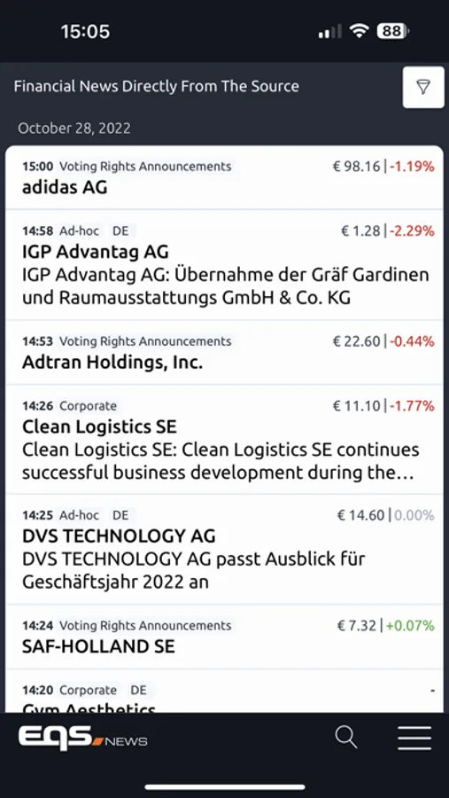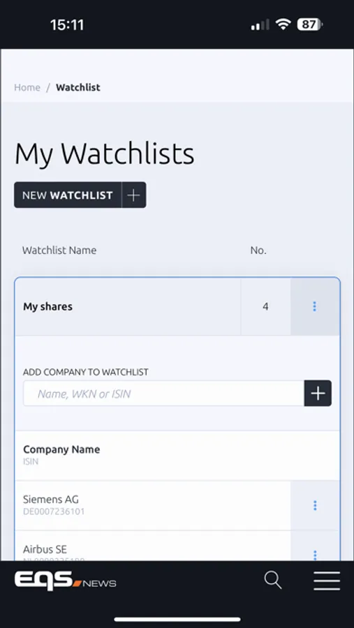 With the newly developed EQS News App (formerly DGAP News), you will be informed about all announcements (such as ad hoc announcements, corporate news and voting rights announcements of companies from your watchlist) via push notifications. EQS News App provides you with corporate news from more than 1,500 listed companies.