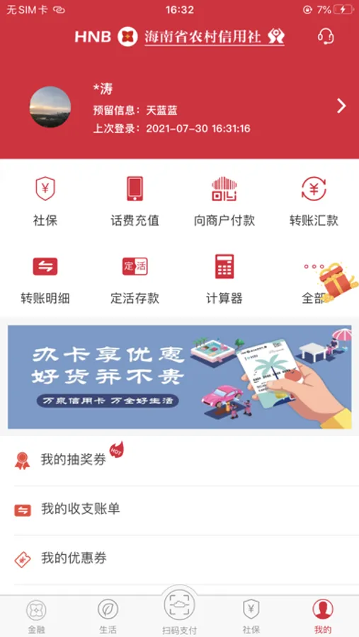 本软件是海南省农村信用社为个人客户量身打造的iPhone版手机银行服务平台,可让您随时随地享用银行服务,如余额查询、交易明细查询、行内转账、跨行转账、手机充值等。此外,简洁流畅的UI设计,为您提供优良的使用体验。我行手机银行采用了多重密码保护机制,加以手机动态密码多重认证,保障您的交易资金安全。