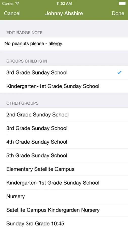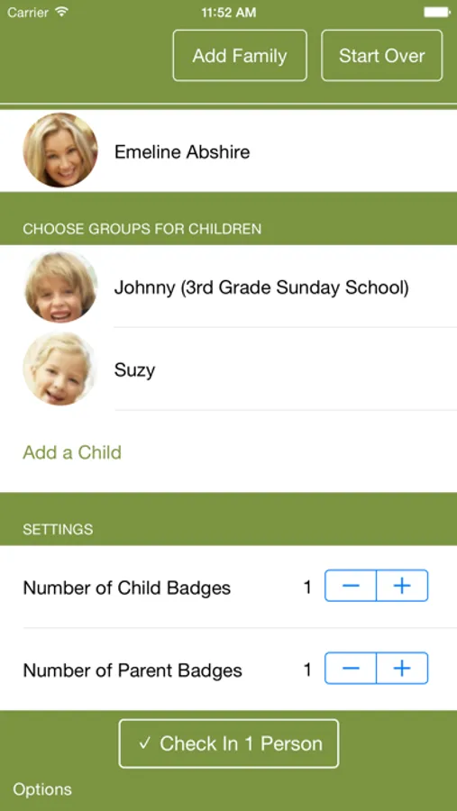 You can choose the group to check each person into, add new children and families, and edit the notes that print on the badges.