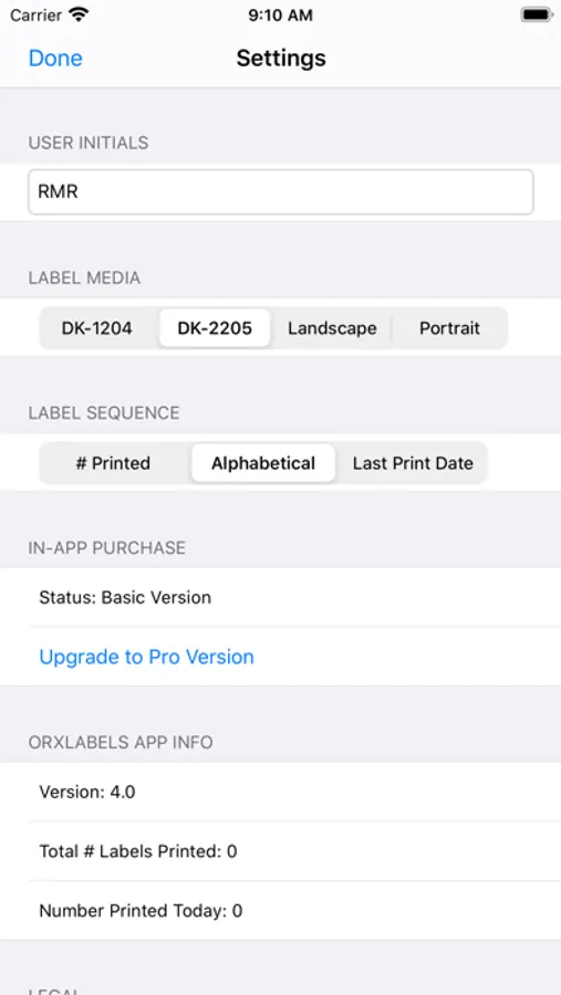 The Basic version of the app is limited to printing 12 labels per day after the first 100 labels. The Pro version may be purchased In-App and allows for unlimited printing.