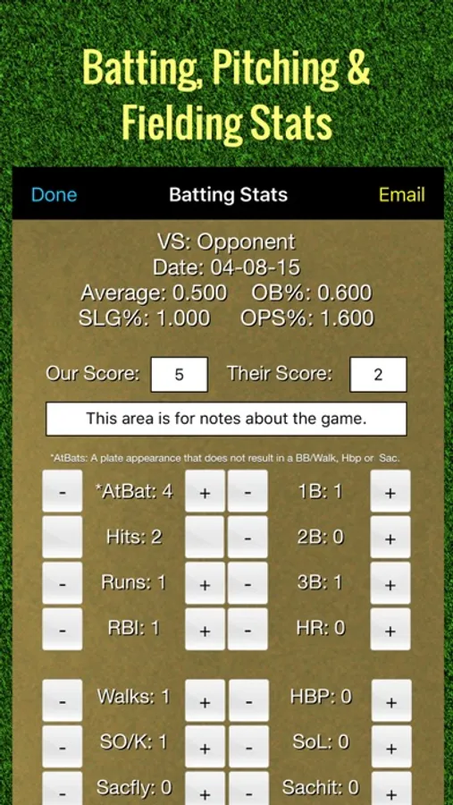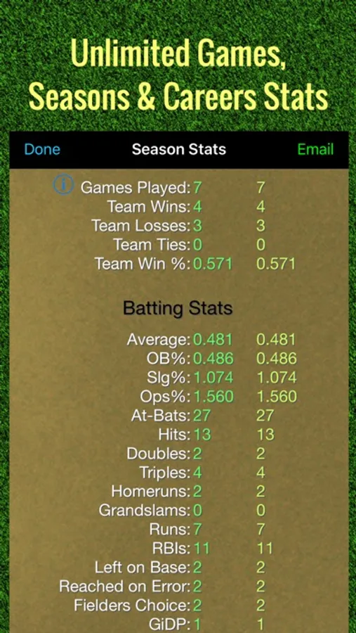 Keep track of stats for Softball, Baseball and Kickball all on your iPhone, iPod Touch and iPad. While other stat trackers only let you keep track of games, Softball Stats Tracker allows you to keep track of games, seasons and even careers!