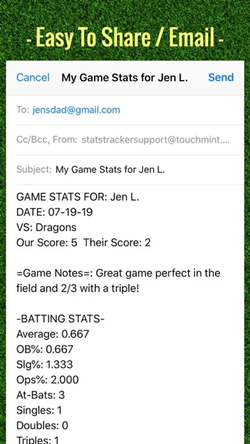 Email out results for over 90 stat categories! Email out as games, seasons or even whole careers. Email your games stats to friends, parents, coaches and scouts!