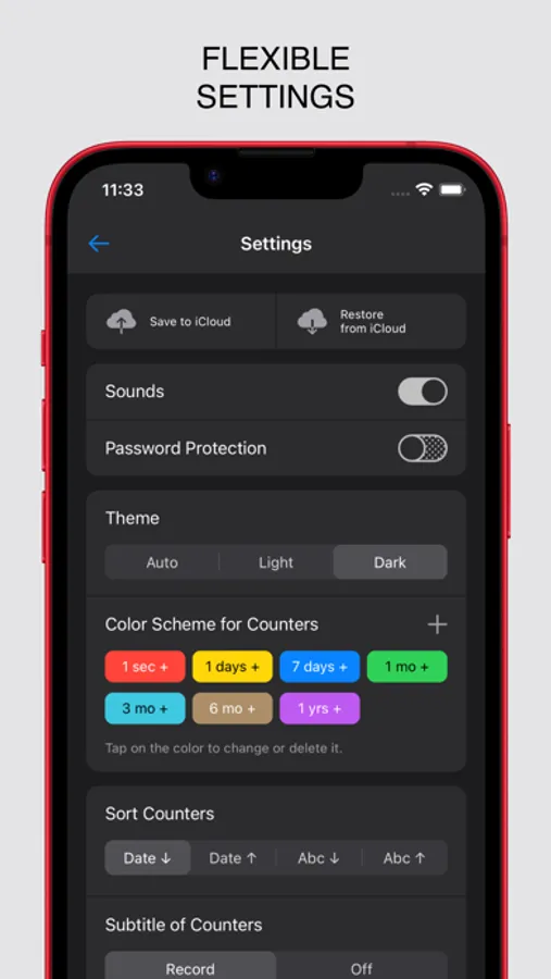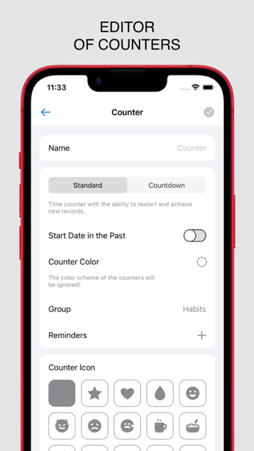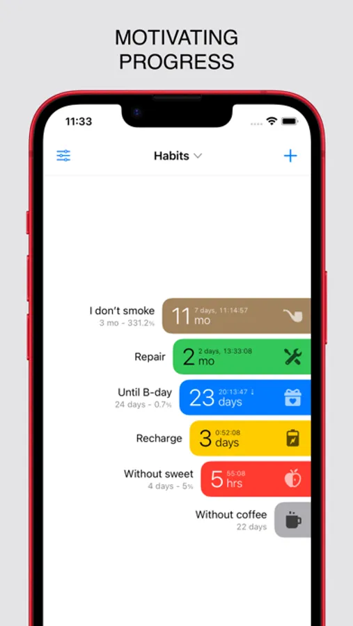 Motivating counters visualize the countdown, allow you to track your progress, and support you in the fight against harmful habits. You can choose different types of counters and group them for more convenient management. The missed restarts function will help if you forgot to restart or stop the counter on time, and the customizable color scheme will color different time intervals.