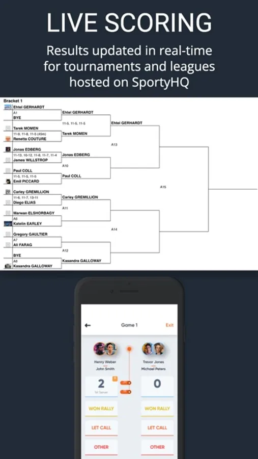 • Live scoring: For tournaments and leagues using SportyHQ, point-by-point results are posted in real-time, with results automatically updated at the conclusion of the match.