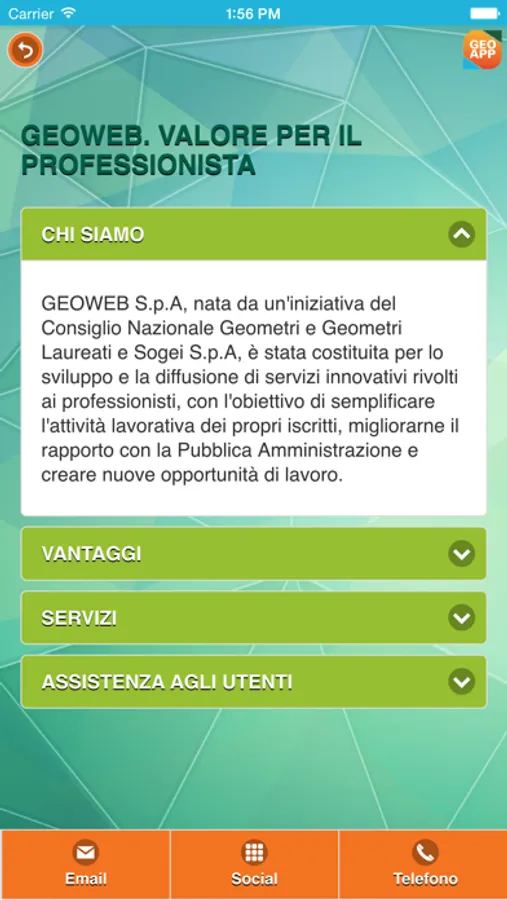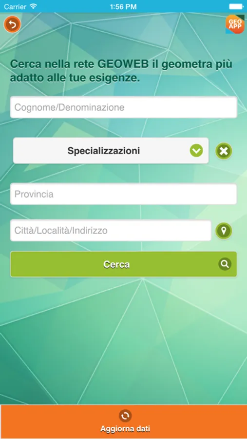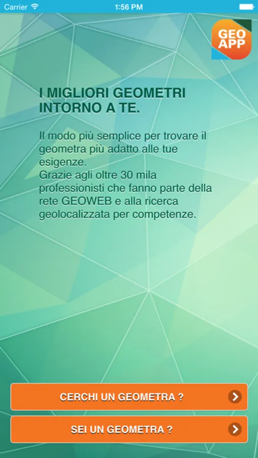 E se sei un professionista, iscriviti subito a GEOWEB e fatti trovare da tanti nuovi clienti. Su GEOAPP avrai una vetrina gratuita, personalizzata con i tuoi dati e specializzazioni, dove caricare foto e immagini.