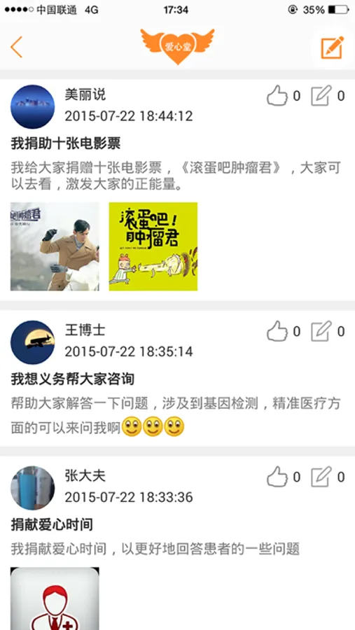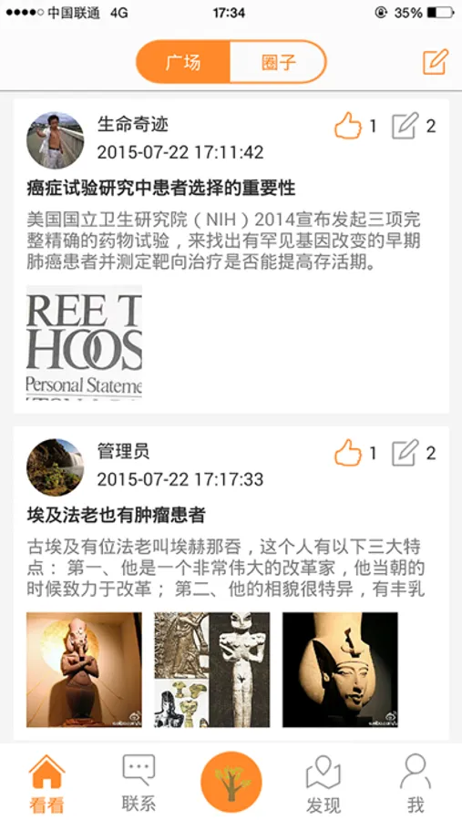 3、【广场】源自病友、医生、爱心人士的心情感悟、治疗经验、友情祝愿等在您的指尖滑动,收获感动,更勇敢地面对。我们提倡以积极的心态来加强人体的免疫系统,更好地对抗病魔。