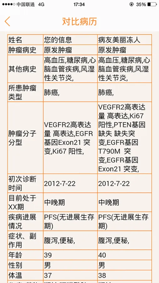 2、【添加病程】肿瘤治疗是一个漫长的、艰苦的战斗,记录下病情、治疗措施和使用的药物等信息,不断更新和完善病历,软件能帮助患者在任何时间查找到最为相似的病友。