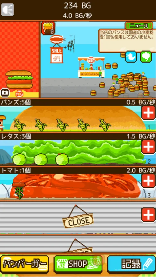 サクサク進む!クリッカー系の放置育成で無限にハンバーガーを増やすゲームです。