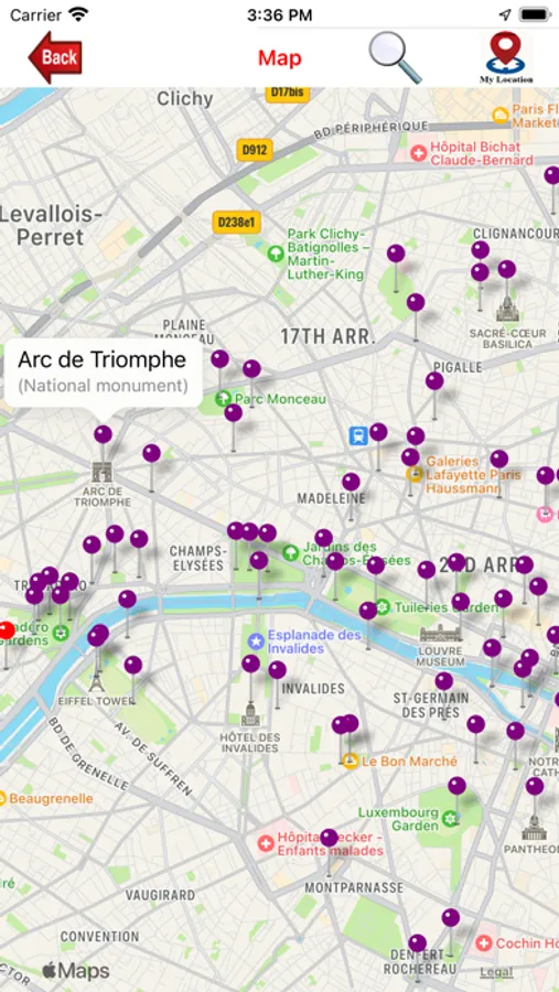 Map - The map is mainly centred around Paris and its surrounds. It uses four coloured pin-drops. Purple pins shows all 123 sights. Red pins shows the location of hotels you've entered, green pins shows the locations that you wish to find, and the blue pin shows your current location. When you are in Paris, the 'Locate' button will pin-point your current location with a blue pin-drop. There is also a 'Find' button that allows you to find an address or place that you've entered and this location is shown with a green pin-drop.