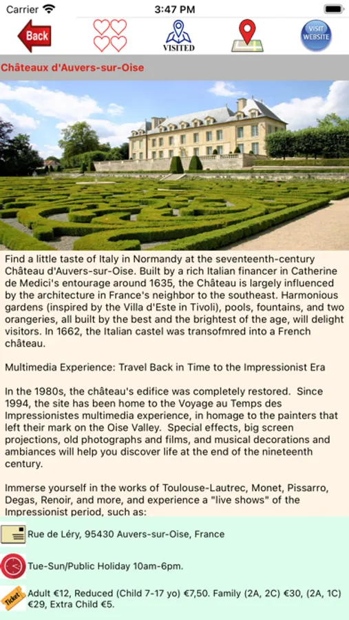 Sights - All 123 sights are listed. When you select a sight, a summary of the sight will be displayed including the address, opening times and entrance fees. You have the option to visit its website, display map location, give a rating for the sight or mark it as visited.