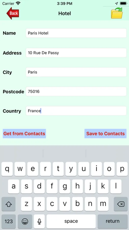 Hotels - You can enter the name and address of a hotel or get one from your Contacts. When you press the 'Save' button, the hotel will be shown on the map. This will provide an indication of how far the sights are from your chosen hotel address. More than one hotel addresses may be entered. You can then go back to the Map section to see the locations (shown by red pin-drops) of these hotels. You can also save the hotel details to your contacts.
