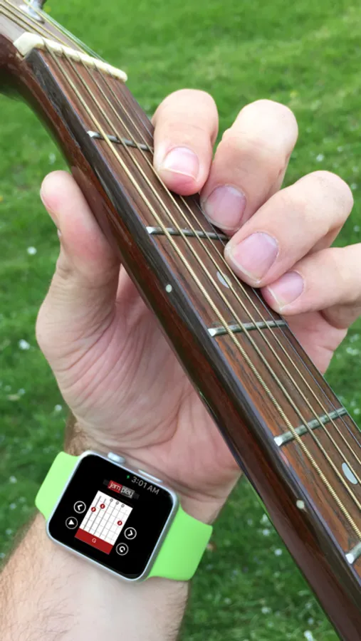 Have an Apple watch? Flip it around so that it's on the inside of your wrist. The chord charts will appear on the watch so you can see exactly how to hold the chord without having to put your guitar down!
