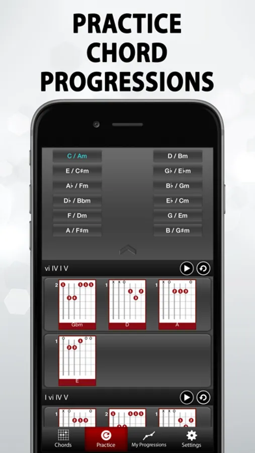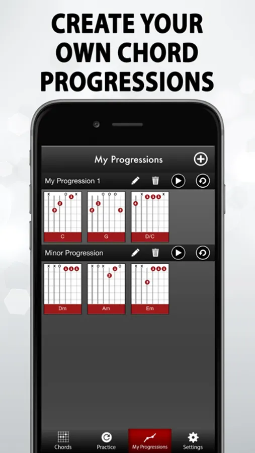Once you've mastered a few chords, you can practice them as a part of a chord progression. Choose from chord progressions we have made for you, or make your own!
