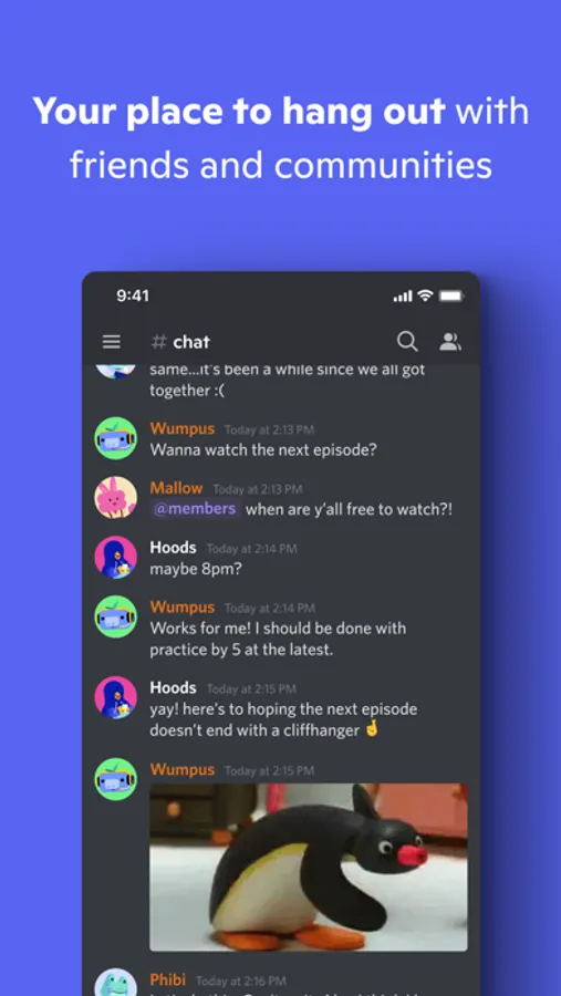 Discord is where you can make a home for your communities and friends. Where you can stay close and have fun over text, voice, and video chat. Whether you’re part of a school club, a gaming group, a worldwide art community, or just a handful of friends who want to spend time together, Discord makes it easy to talk every day, and hang out more often.