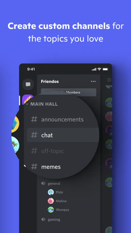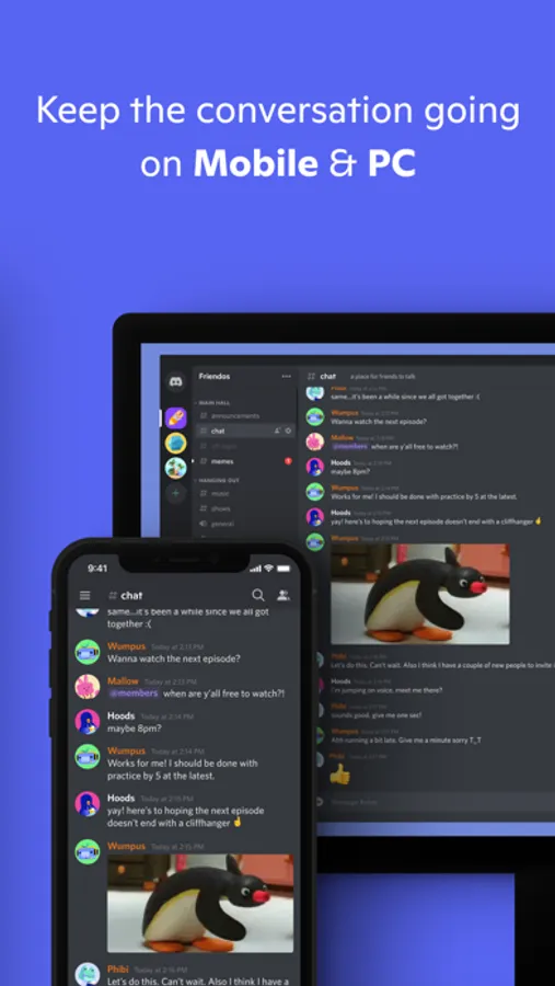 • Discord servers are organized into topic-based channels where you can collaborate, share, have meetings, or just talk to friends about your day without clogging up a group chat.