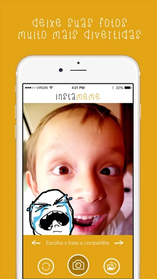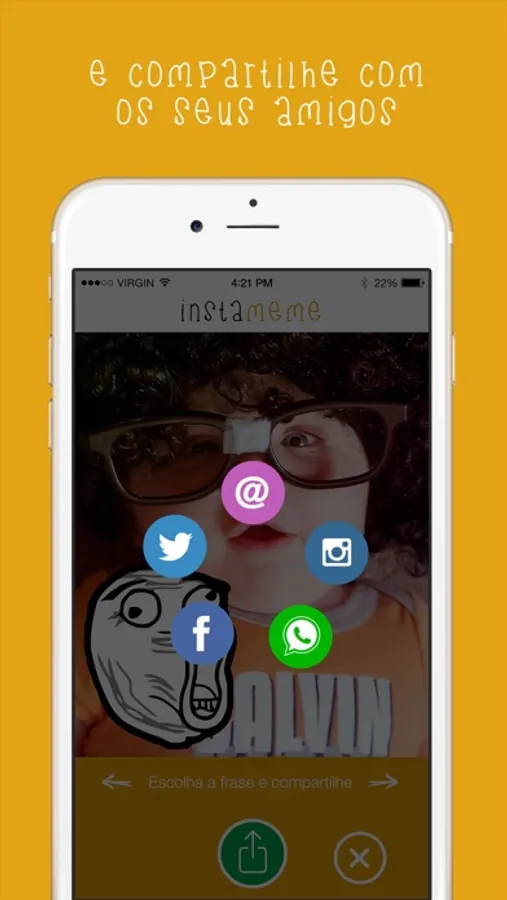 Você tira a foto, escolhe o MEME e depois envia para todos os seus amigos. Fácil e divertido.