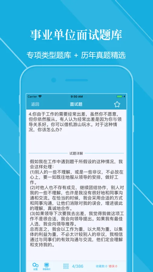 本软件为事业单位面试考试题库的软件,精心准备了2023年最新考试模拟题库。试题类型包括综合分析题、自我认知题、人际关系题、情景应变题、组织管理题、
