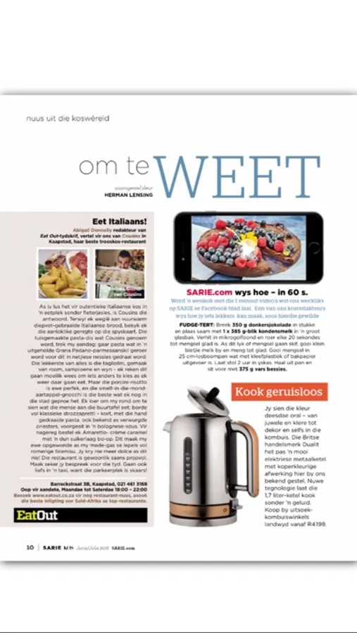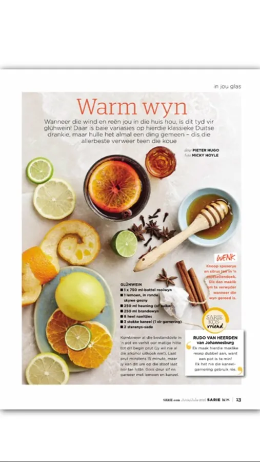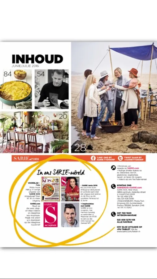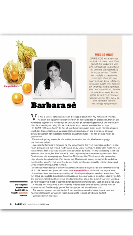 SARIE KOS: it’s a lifestyle and a hearty conversation. We talk food, and the conversation is mouth-watering and proudly South African. It’s for everyone who is inspired by the modern-day Afrikaans style of cooking and entertaining.