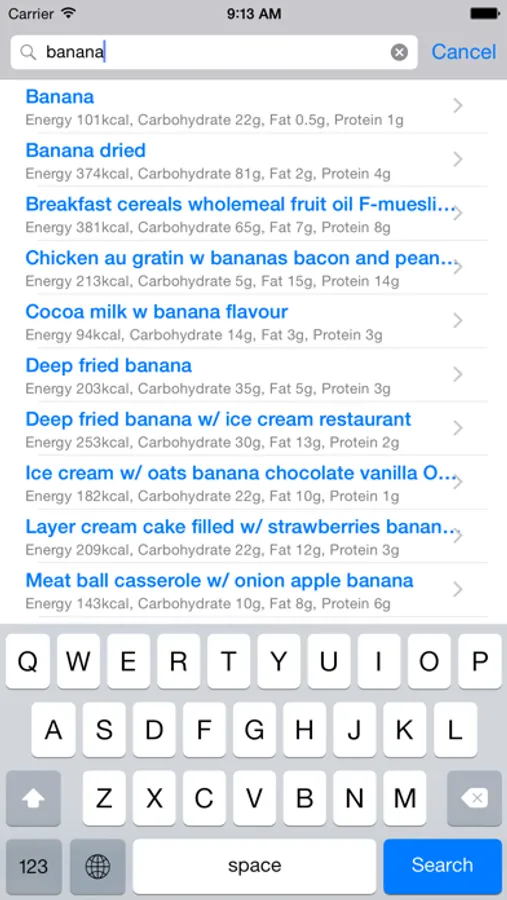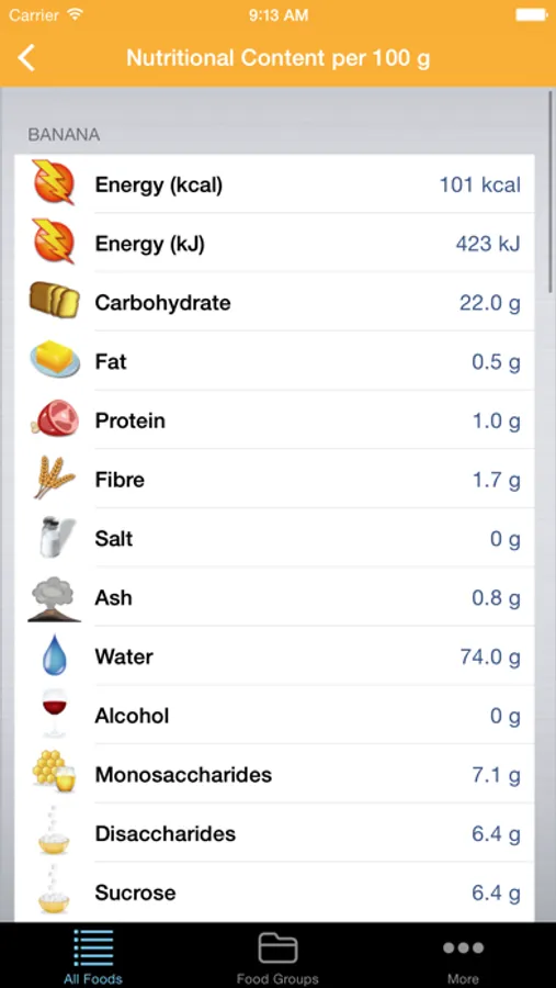 The Food Content App makes it easy to find nutritional content informations such as energy (calories), carbohydrate, fat, protein, vitamins, minerals, etc. You can search among over 2000 foods in a complete food and nutrition database. For each food you can also find more detailed nutritional information such as the amount of fibre, salt, water, waste (e.g. peel), saturated and unsaturated fat, omega-3, etc.
