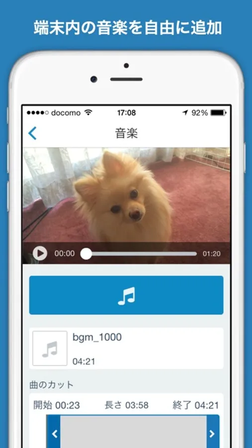 追加する音楽にはトリミング(任意の範囲を切り取って)、音量調整、フェードイン、フェードアウトの効果を設定することができます。