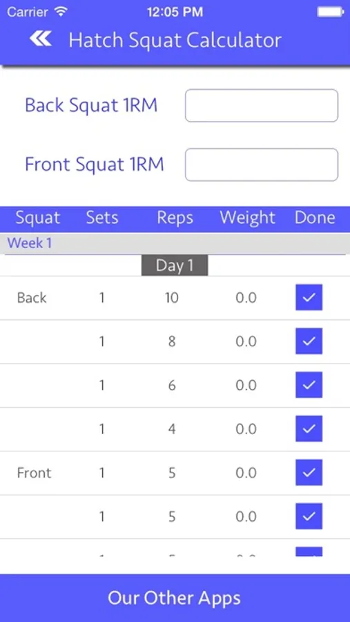 No more fiddling with spreadsheets and print outs at the gym. This app calculates the weights you should use, based on your one rep maxes, for the 12-week Hatch Squat protocol. The app also makes it easy to keep track of where you are in the cycle and the progress you make from cycle to cycle.