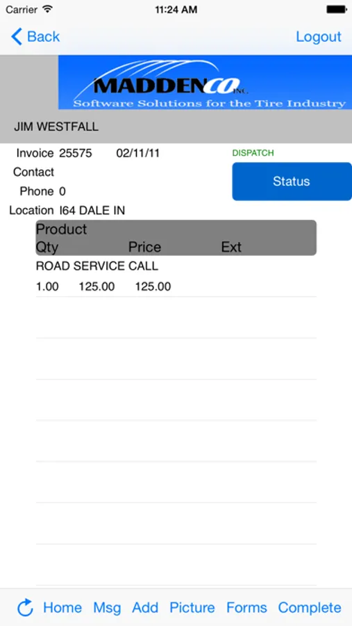 MciService, This App written by MaddenCo, Inc., the writers of "The Tire Dealer System" allows tracking of Road Service calls from dispatched to completed. The driver has the capability to change his status from customized statuses such as Dispatched, En-Route, On-Site to Job Complete. The app will also allow the Service Tech to fill out forms, take pictures and capture signatures. All are associated and emailed with invoice.
