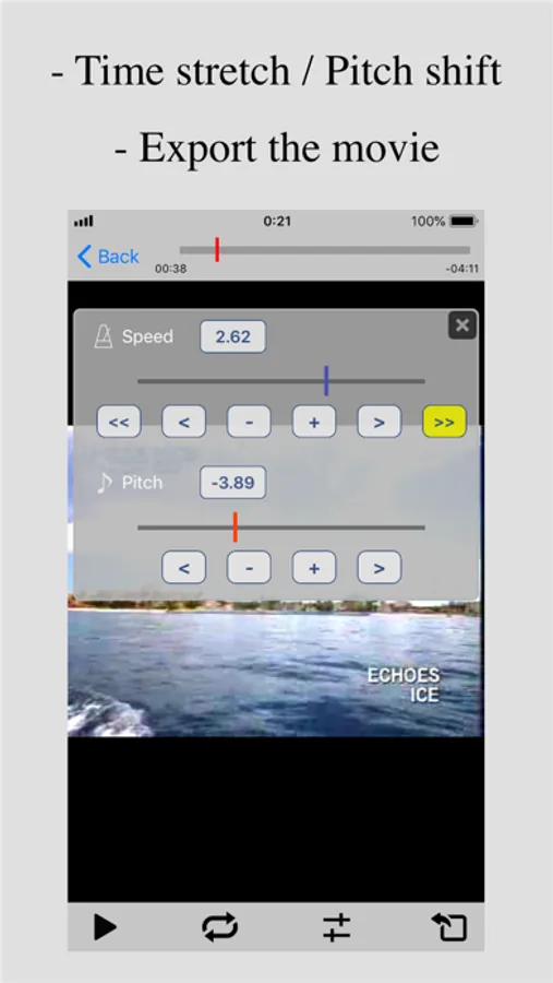 And it can save (Export) the movie reflects speed / pitch.(Free trial for the first one only. After that, required In-App Purchase.)