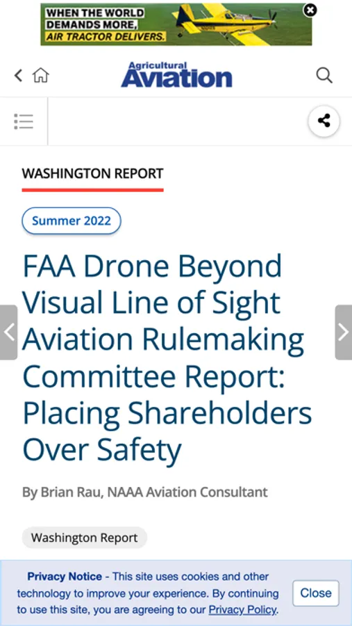 As the official publication of the National Agricultural Aviation Association, Agricultural Aviation magazine is the premier source for scientific research and technological information, business services, industry trends, NAAA association services, and regulatory and legislative activities related to the agricultural aviation industry.