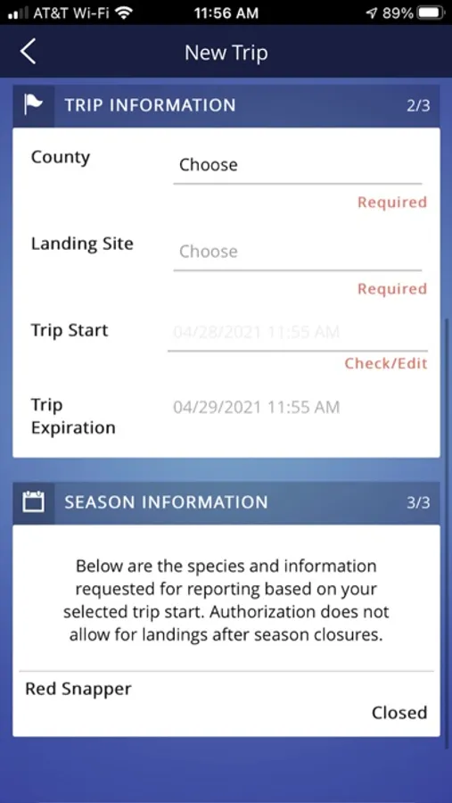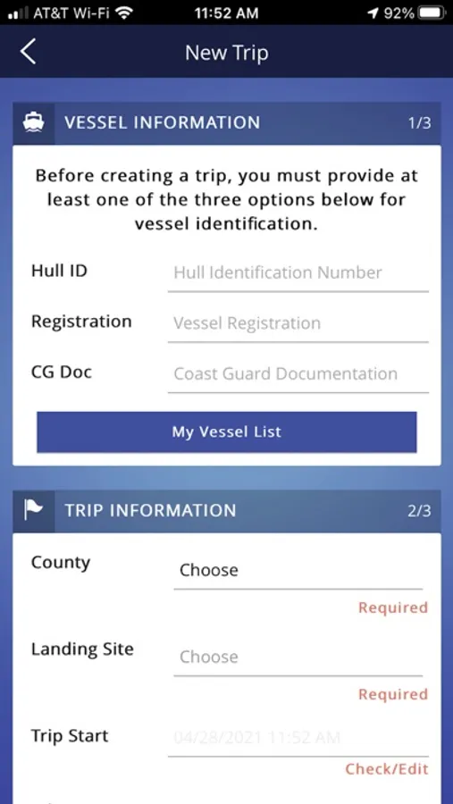 The required information collected at the end of each trip includes: landing location of vessel, the number of anglers, time spent fishing, the number of Red Snapper harvested and the area fished (natural bottom, rig, or artificial reef).