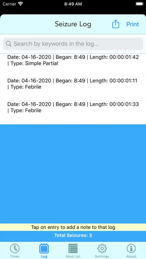 • Print seizure: log, notes, and meds list to wifi-enabled printer!
