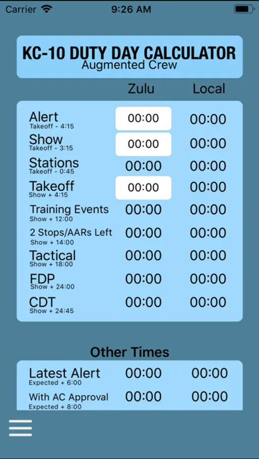 This app will quickly help you calculate all applicable duty day restrictions in both Zulu and Local. Simply enter the Alert, Show or Takeoff time and Vol-3 restrictions will be instantly calculated for you. No more complex calculus at the end of your duty day.