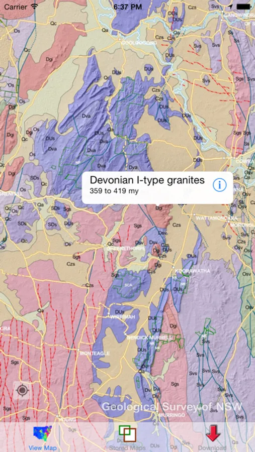 View geology maps and airborne geophysical images produced by the Geological Survey of NSW (Australia). The maps and images are downloaded to your phone so that no mobile reception is required in the field. Your location is always indicated on the map, and the map can be re-centred to your current location at any time with just one touch. The simplified geology map displays 106 broad rock types and is interactive. When the screen is touched the name and age of the underlying rock type is displayed in a pop-up. When the pop-up is touched, additional information is displayed. A detailed geology map of the eastern part of NSW will soon be available. This will also be interactive and provide information on approximately 3,000 rock units.
