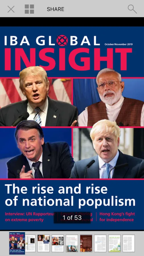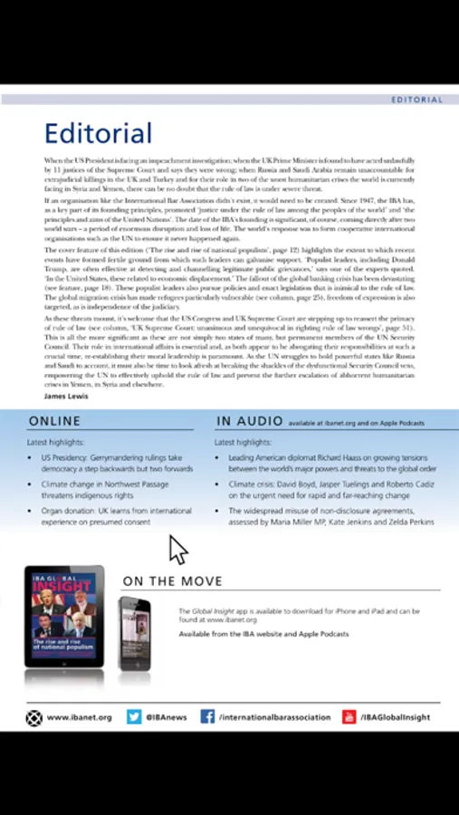 IBA Global Insight is the flagship publication of the International Bar Association (IBA), the membership organisation for the world-wide legal profession. Published six times a year, distributed to all members of the IBA, and available online, IBA Global Insight features in-depth articles by accomplished journalists, covering major developments in international legal, business and human rights issues, and interviews with the leading authorities in these areas. IBA Global Insight also publishes regular comment articles from its columnists around the world.
