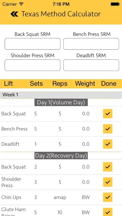 No more fiddling with spreadsheets and print outs at the gym. This app calculates the weights you should use, based on your one rep maxes, for a 6-week Texas Method strength cycle. The app also makes it easy to keep track of where you are in the cycle and how you've progressed from cycle to cycle.