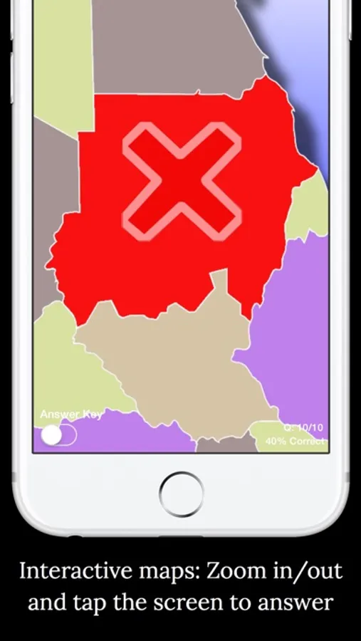 • Fully interactive map (zoom, pan, and tap on the map to select your answer) with sound effects