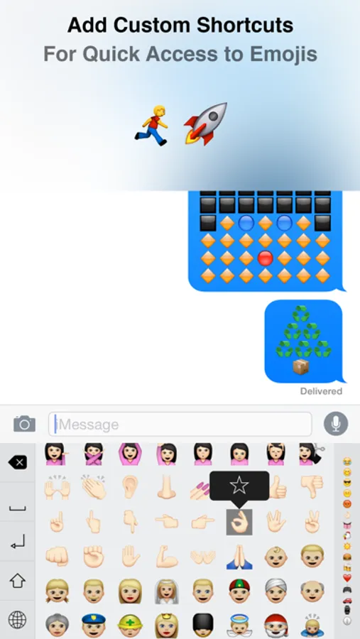 Unlike other emoji keyboard app, Emoji 1000+ allows you to create custom shortcuts by holding on the emojis. You can access them by swiping on the icons locating on the right side of the keyboard.