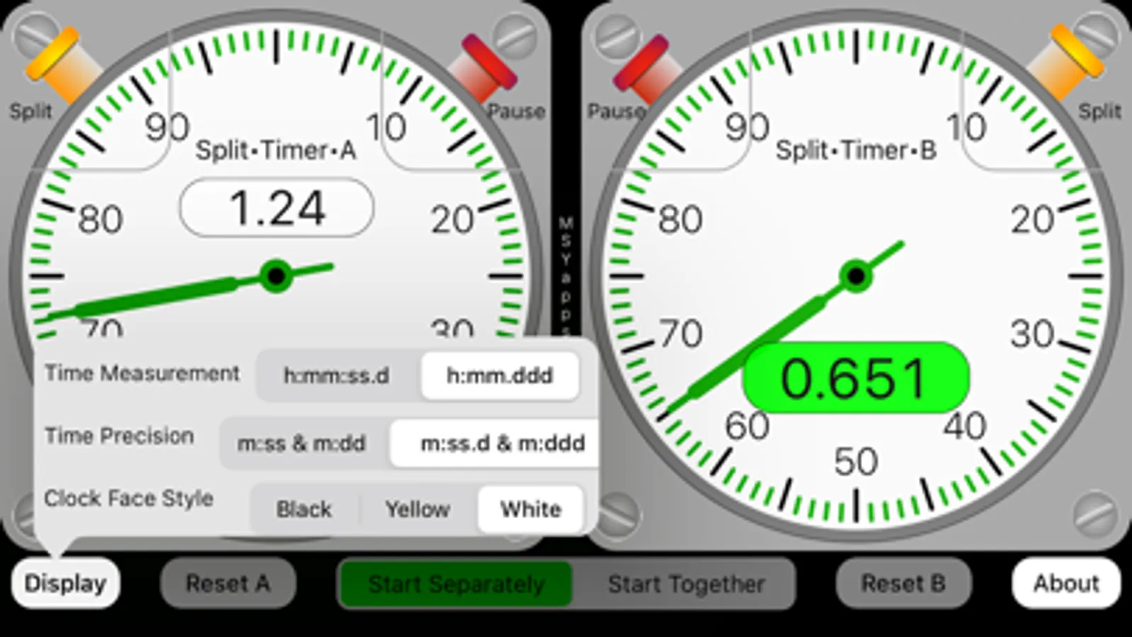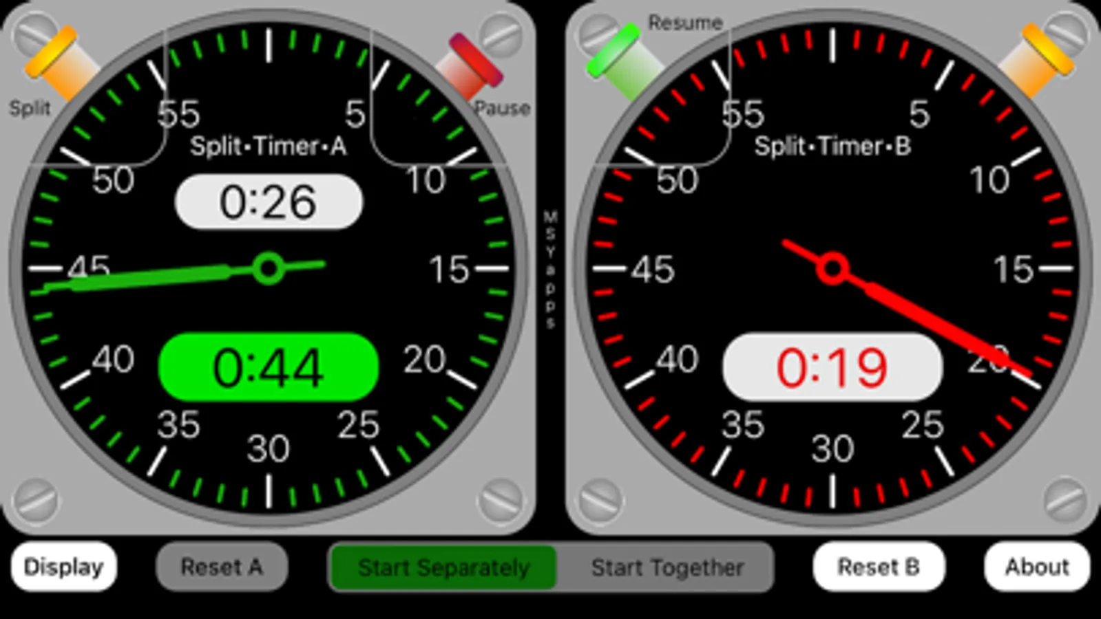 The Dual Splits Timer consists of two stopwatches each with a split timer. The stopwatches may be started and stopped either separately or together.