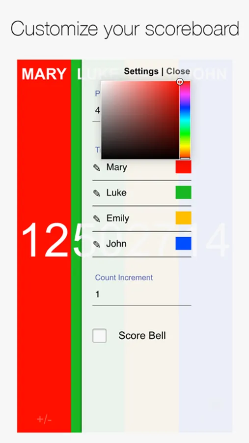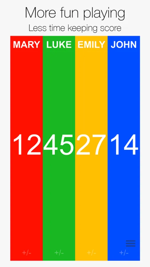 Stop looking around for pen and paper every time you want to play games. Score! is the unrivaled scoreboard for board and card games as well as sports. Players have columns for their scores. Simply tap a column to increase the score. You can personalize it, including setting names, background colors, increment count, even a score bell (optional). This app is complementary to many board games and sports!