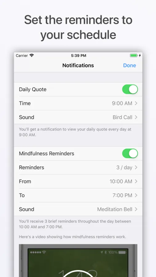 Activate the Mindfulness Reminders function to receive up to 5 notifications per day to bring you back to your center. These brief prompts appear as a banner on your iPhone, bringing you back to the present moment.