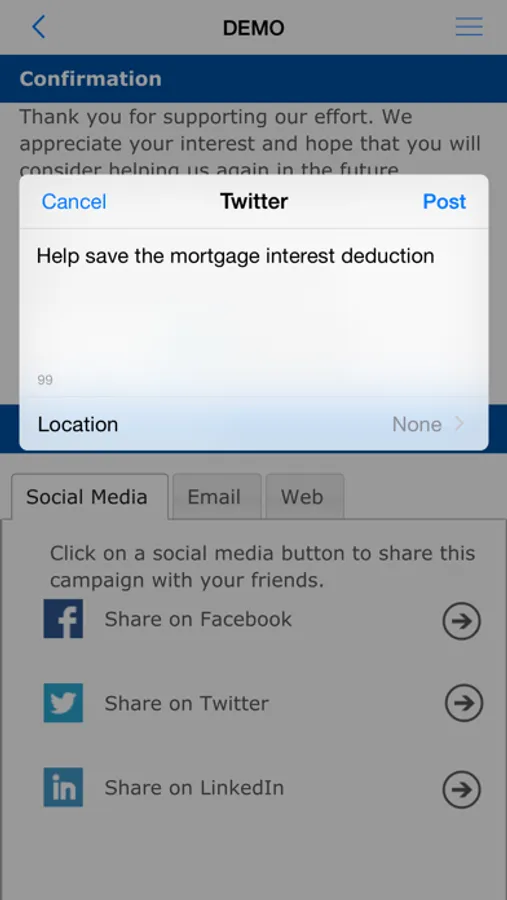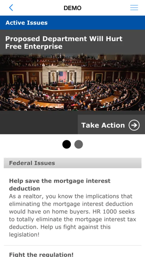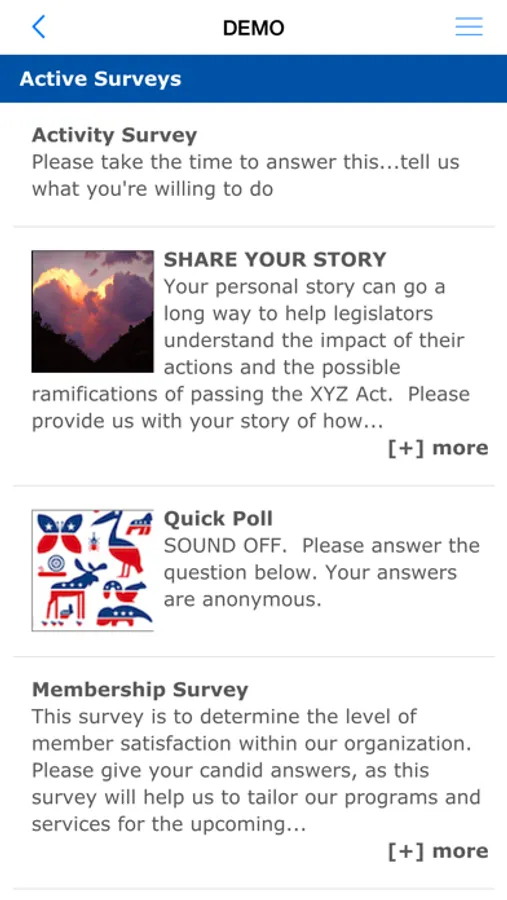 The VoterVoice mobile app provides tools to effectively communicate with policy-makers and stay engaged in the public affairs process. Organizations using the VoterVoice platform can create an Action Center with a variety of features customized for their needs. Depending on the organization's needs, those features may include: