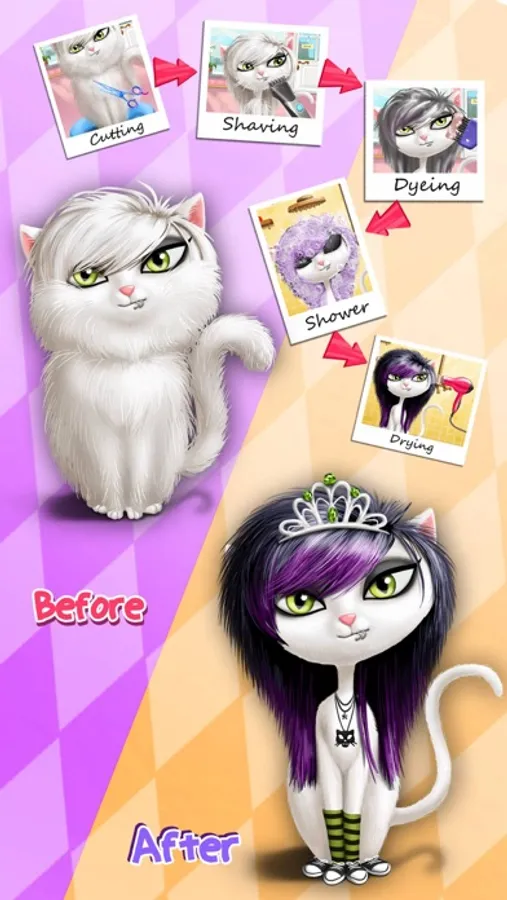 Little Kitten is tired of being all white, fluffy and cute. She wants something different! Get this Kitty Cat a new haircut and dye her hair black and purple, her favorite colors! Hairstyle change is just a start, you’ll need to work on her clothes too. Find fashion items that matches her new radiant hair best!