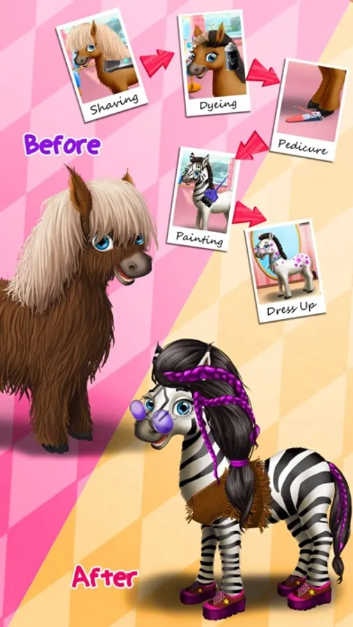 Little pet Llama is so soft and woolly but summer is coming and she wants to be prepared for hot sunny days! Follow the lines to make the right cuts, apply hair dye, shower and dry little Llama. Fun dress up is what’s next: mix and match shoes, glasses, hats, necklaces, scarves and shoulder bags to complete the new looks!