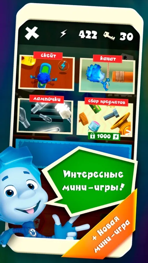 - 3 мини-игры: катание на скейте, лазание по канату и ловля лампочек!